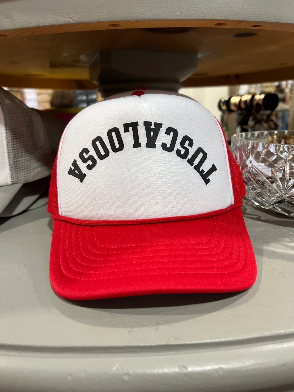 Upside down TUSCALOOSA on crimson trucker hat