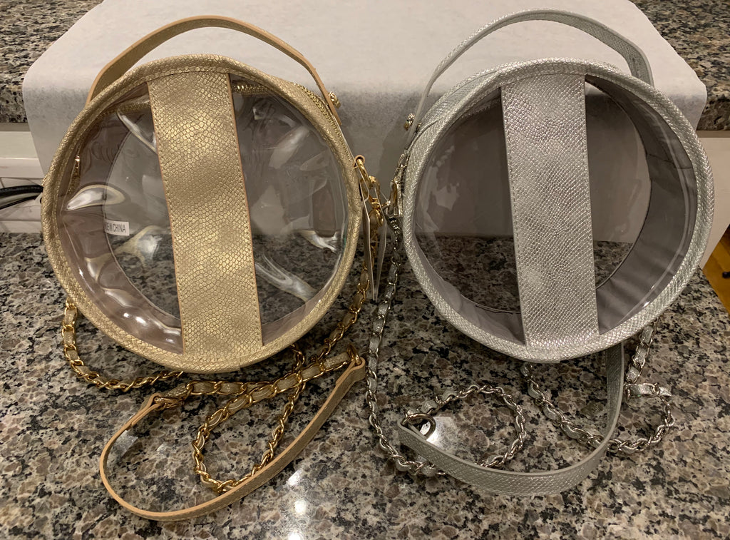 gold and silver round clear bags